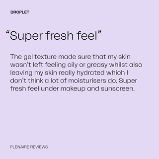 Droplet is 100% silicone-free, so it won’t block pores and helps your skin breathe. High molecular weight Hyaluronic Acid delivers optimum moisture, and helps increase moisture retention.